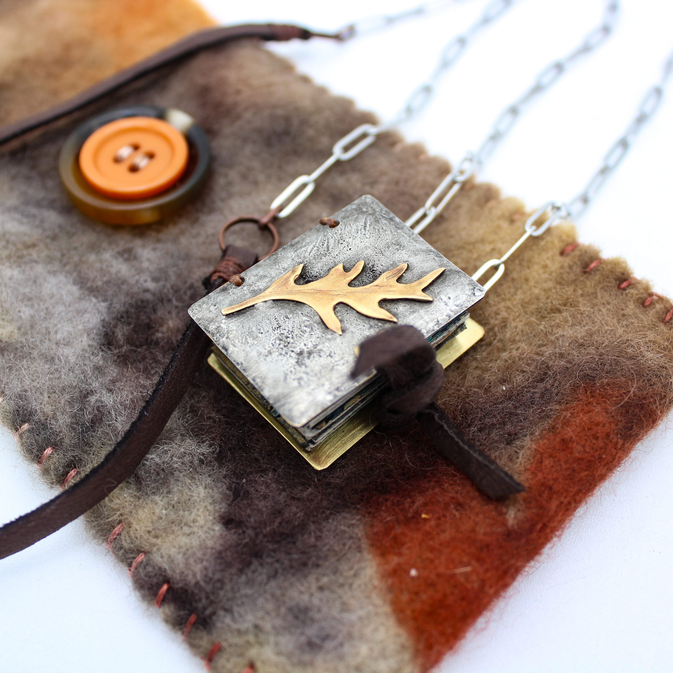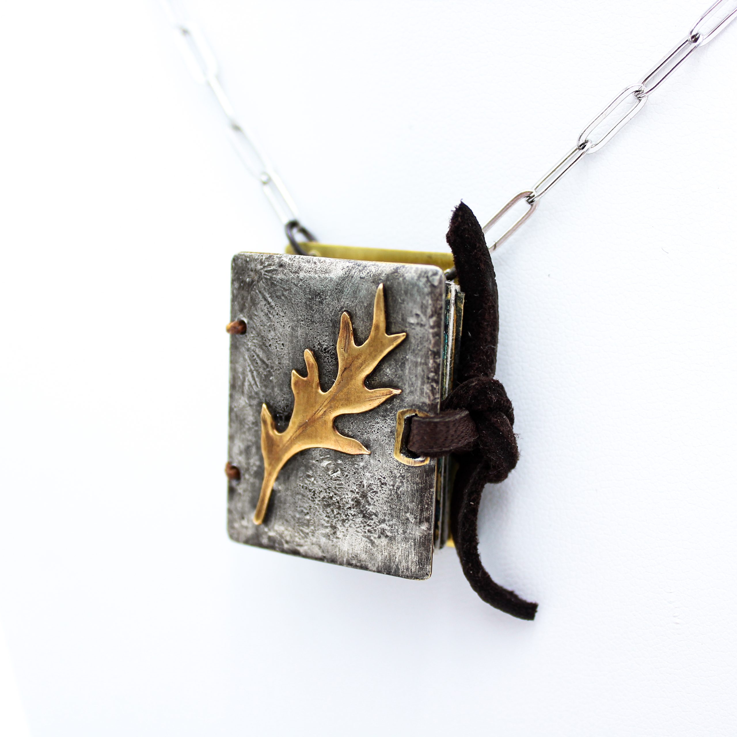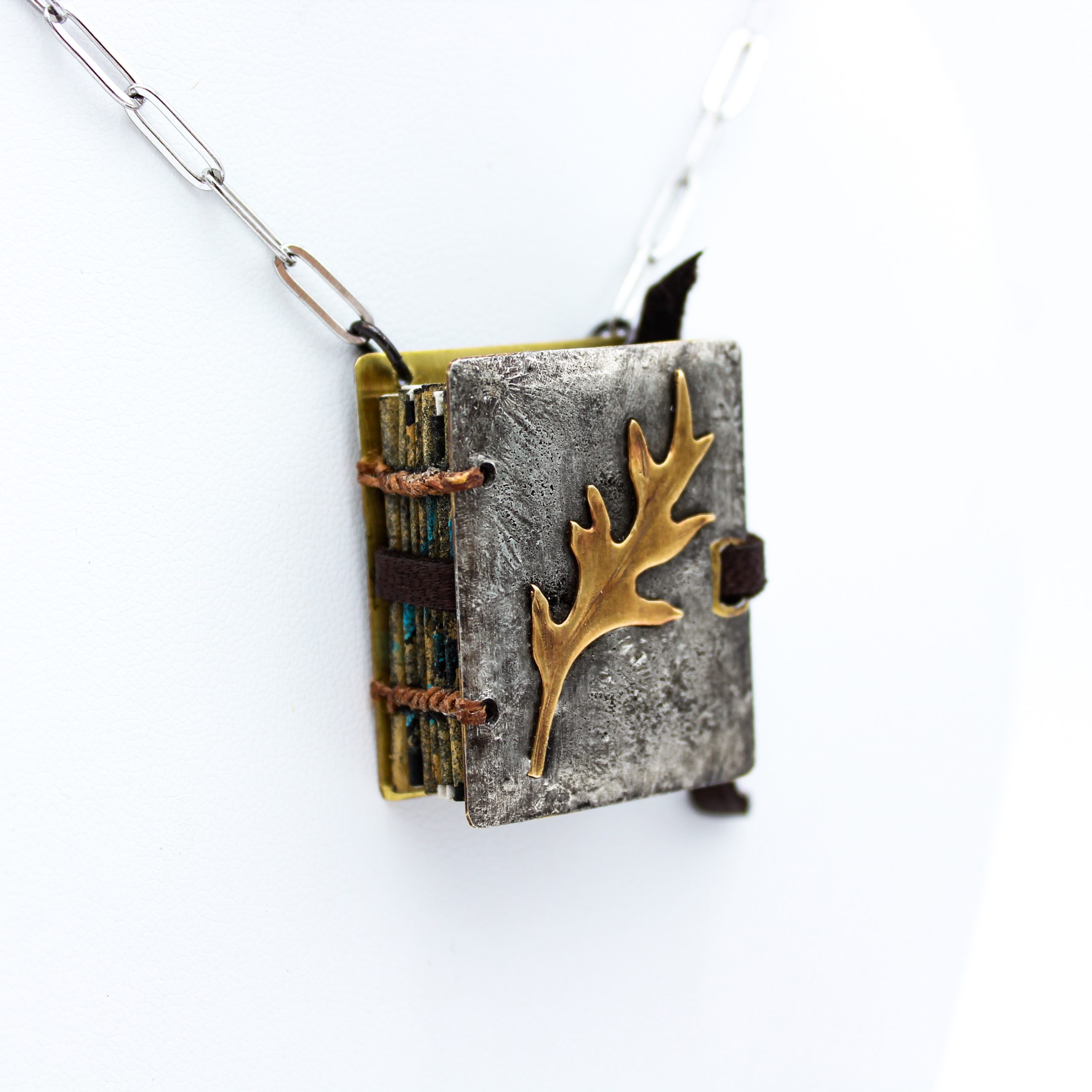 Soldered medieval-style wearable book with handcrafted clasp and an embossed brass leaf