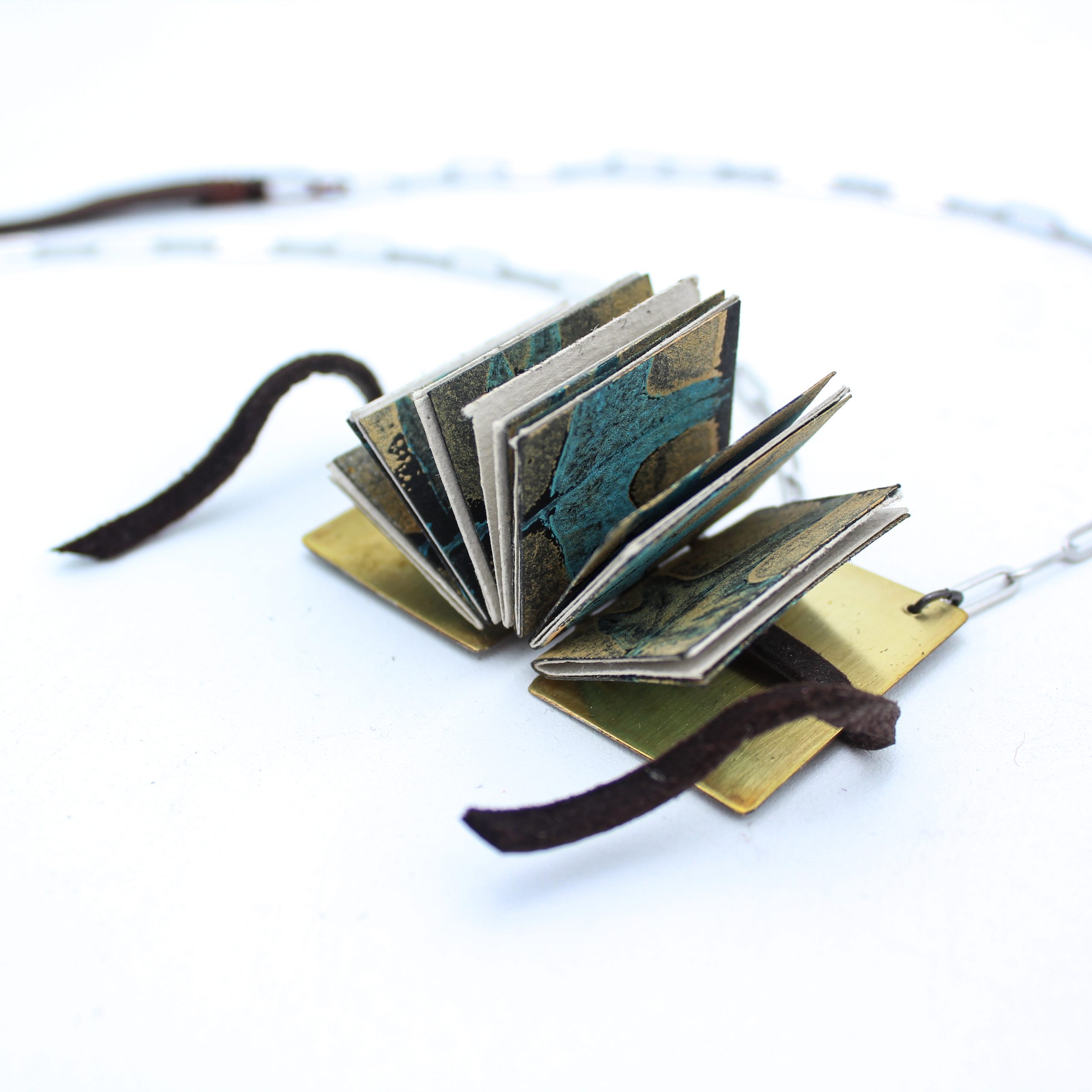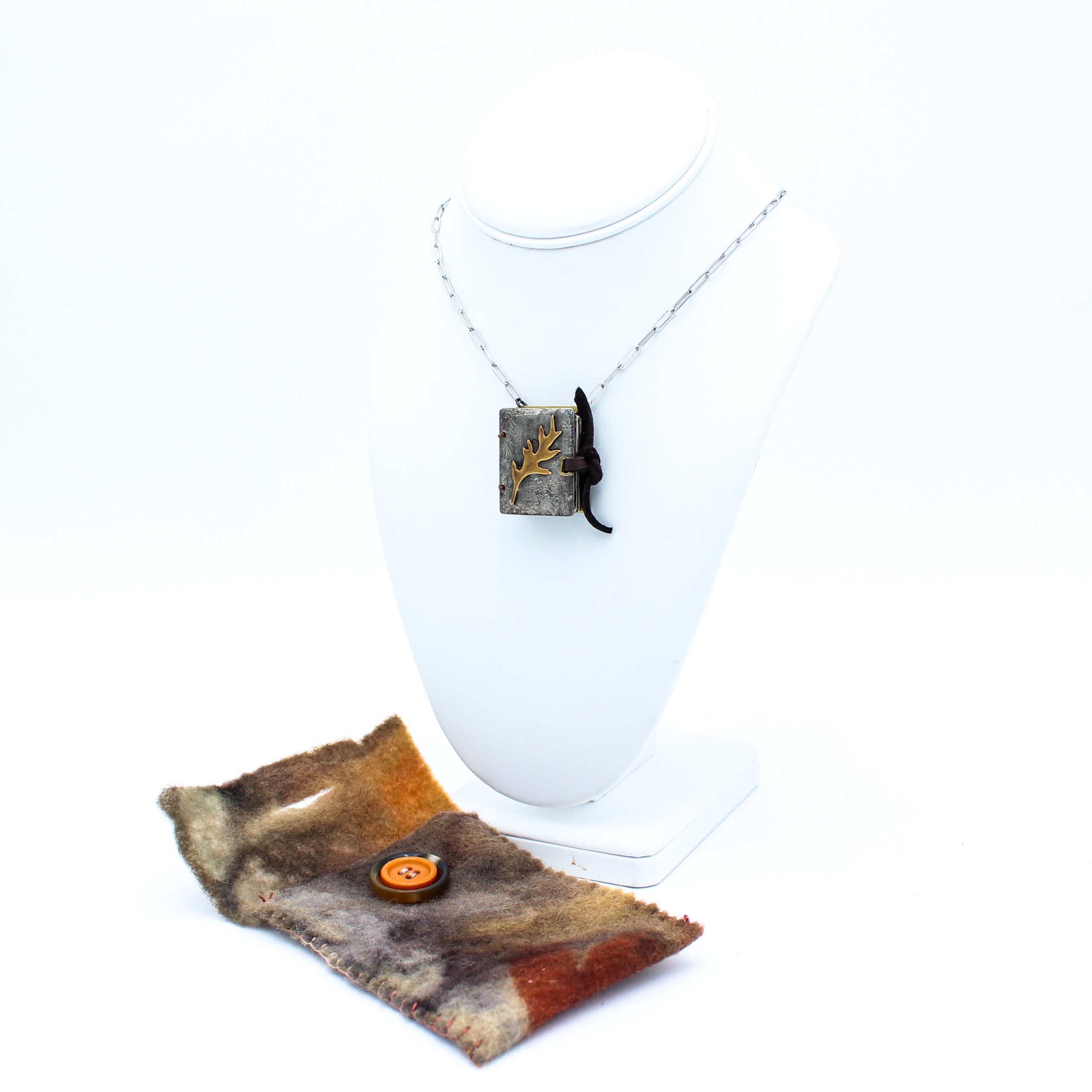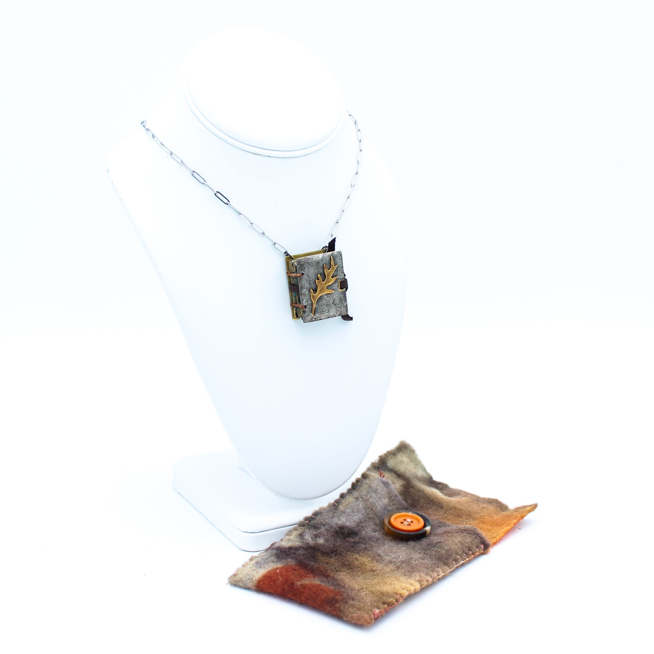 Soldered medieval-style wearable book with handcrafted clasp and an embossed brass leaf