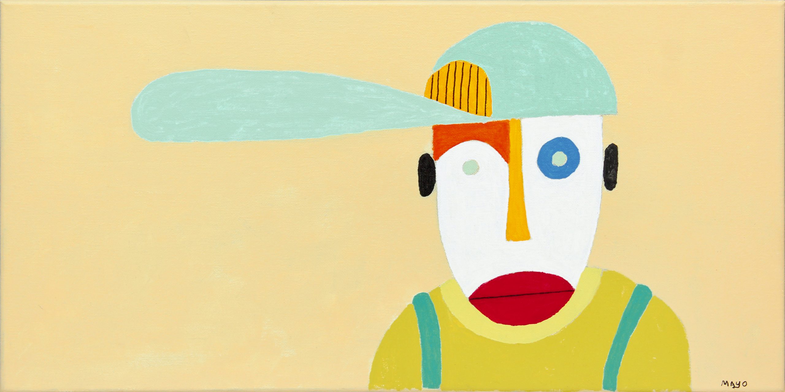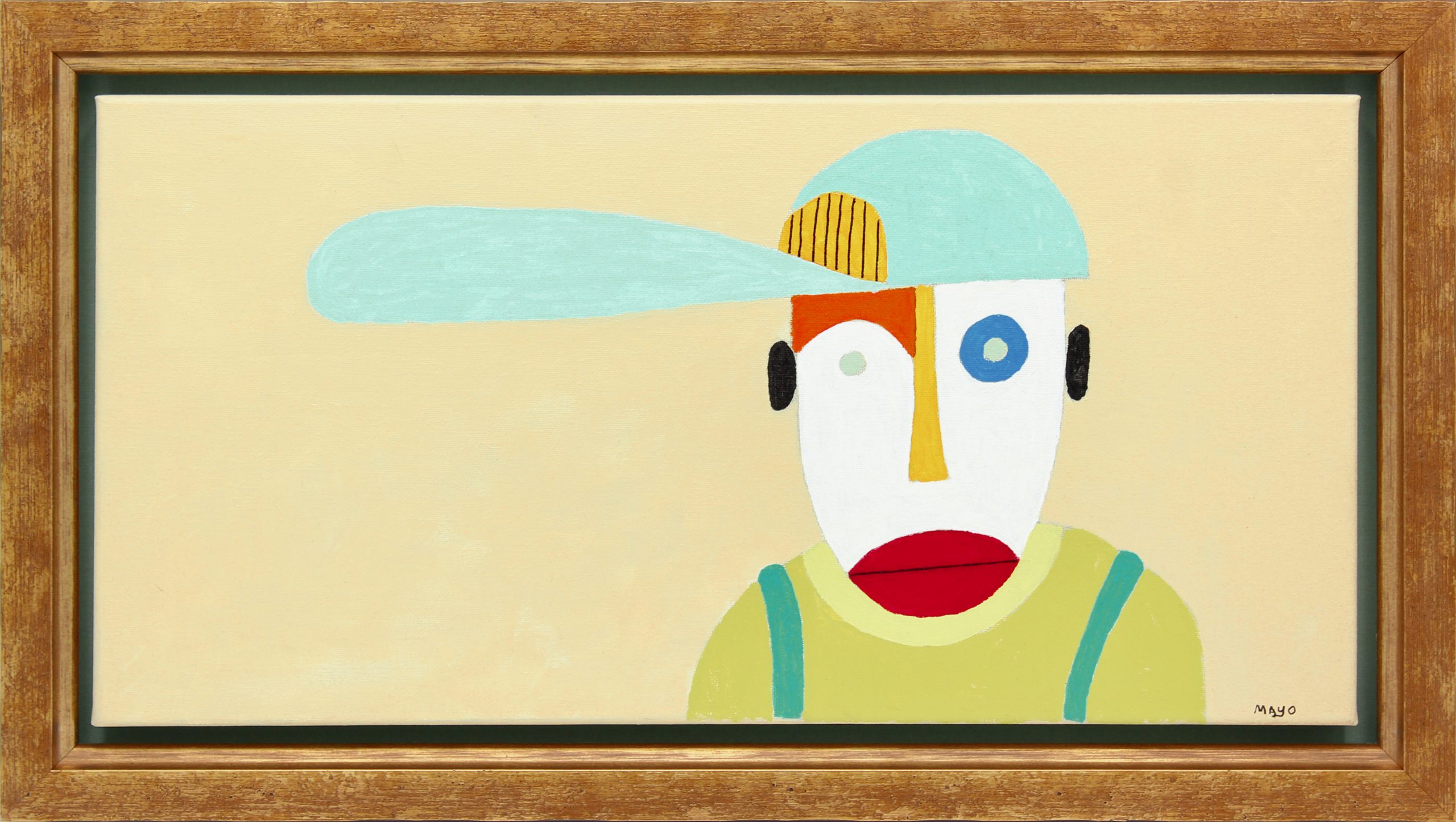 This painting is framed in a beveled gold wood floater frame with light blue backing.