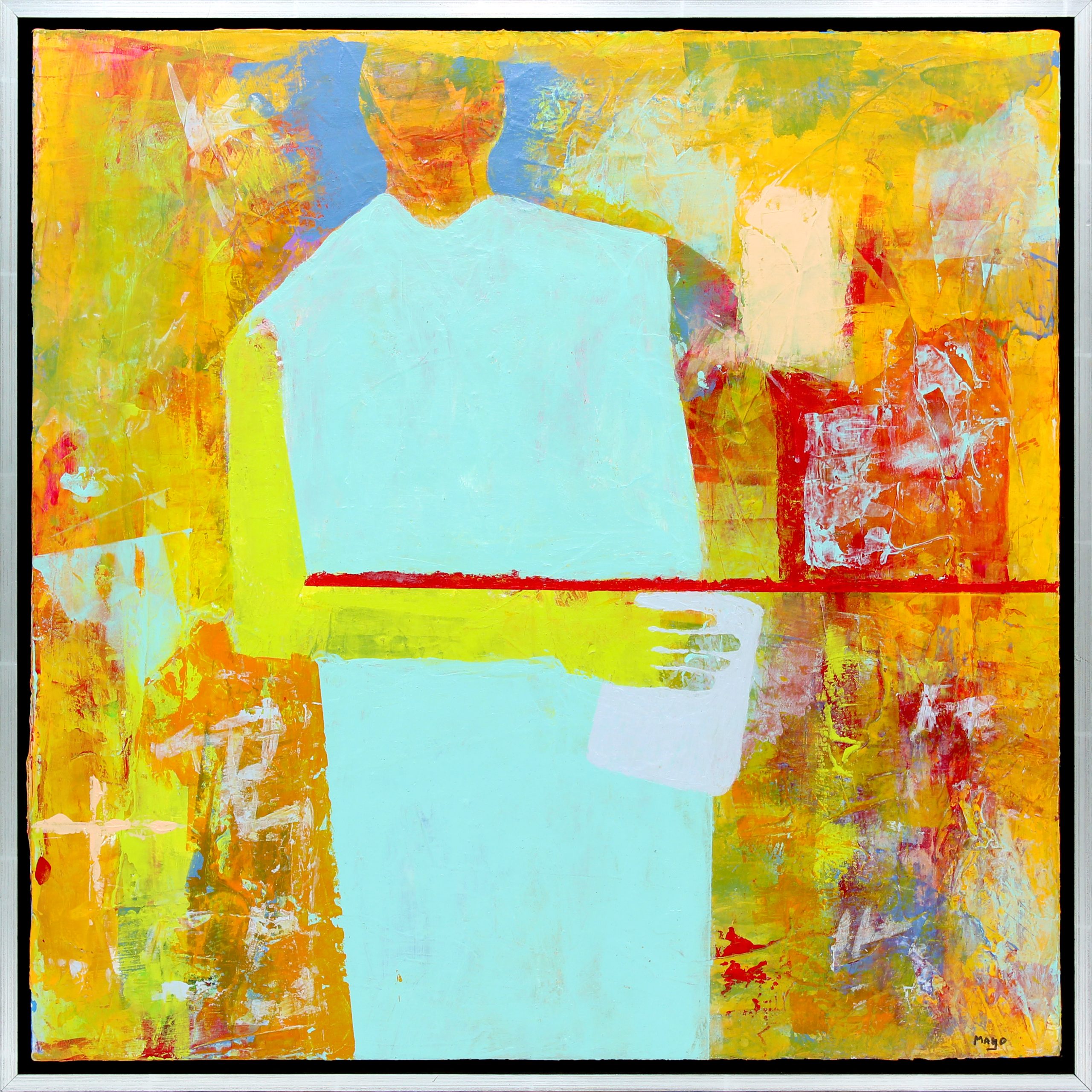 This painting is framed in a silver and black floater frame.