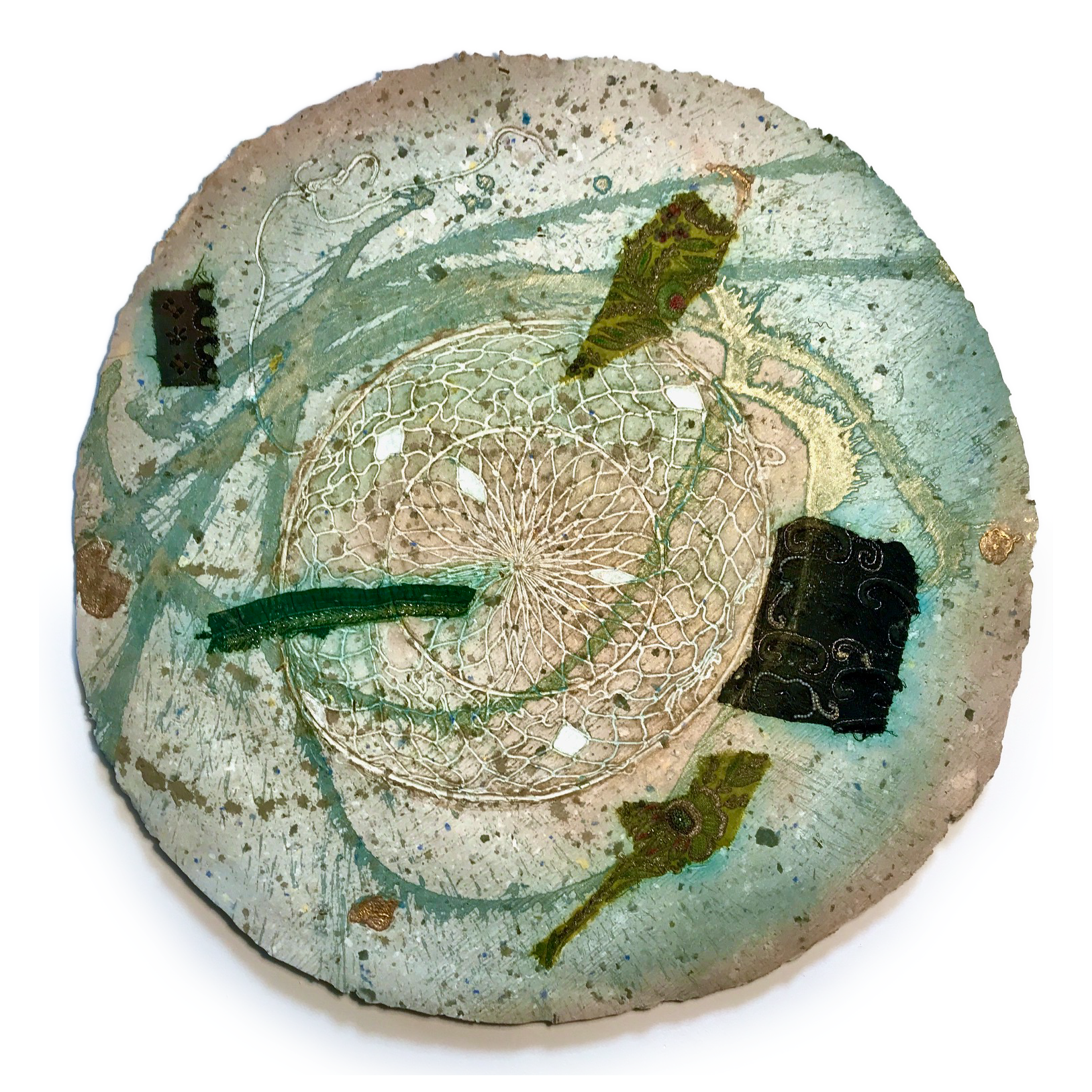 The fisherman’s crab nets featured here capture remnants of saris sourced from my found quilt. Imagine, whole collections are adrift in the Pacific gyres. These nets bring us glimpses of treasures from that watery world.