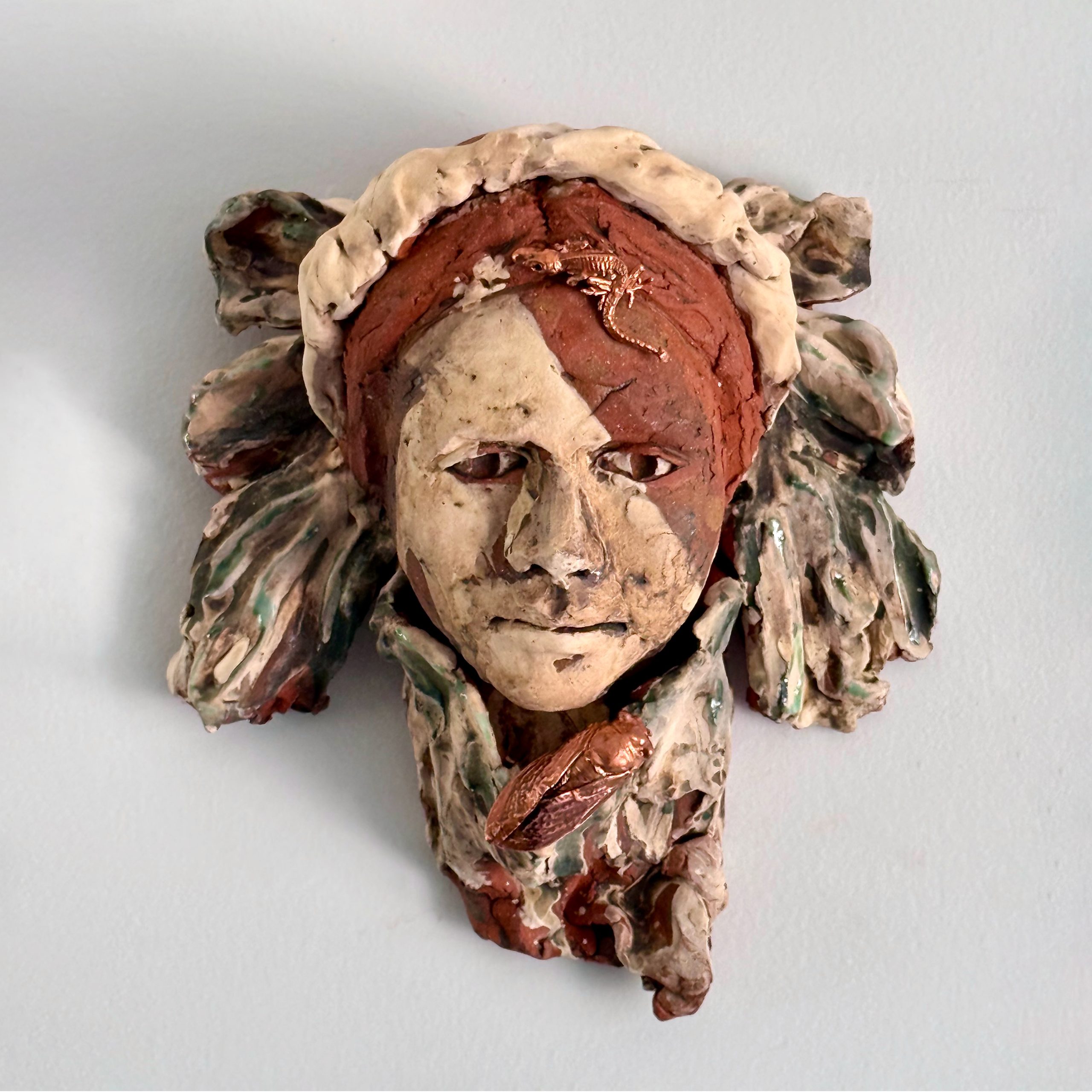 Ceramic wall sculpture with engobe, underglaze, copper electroformed lizard and cicada