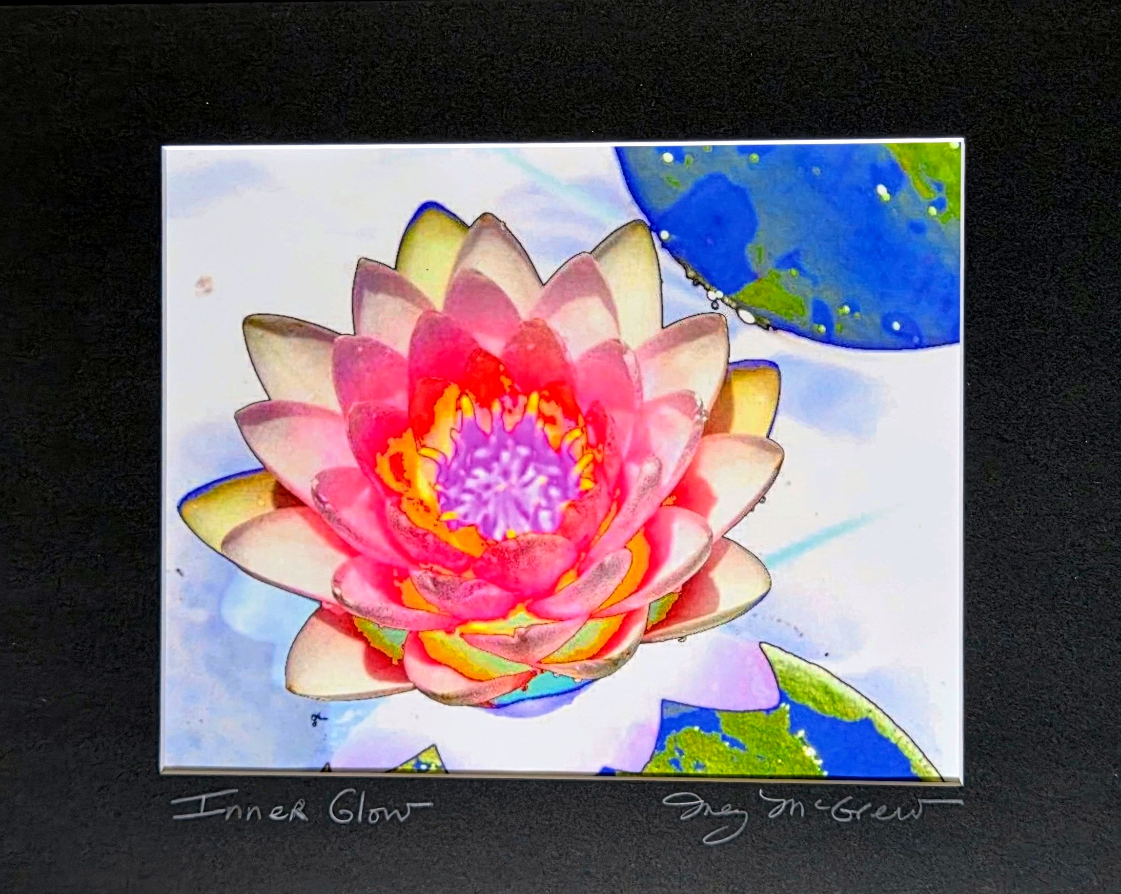 This photograph is framed in a thin black frame with a black mat behind glass.