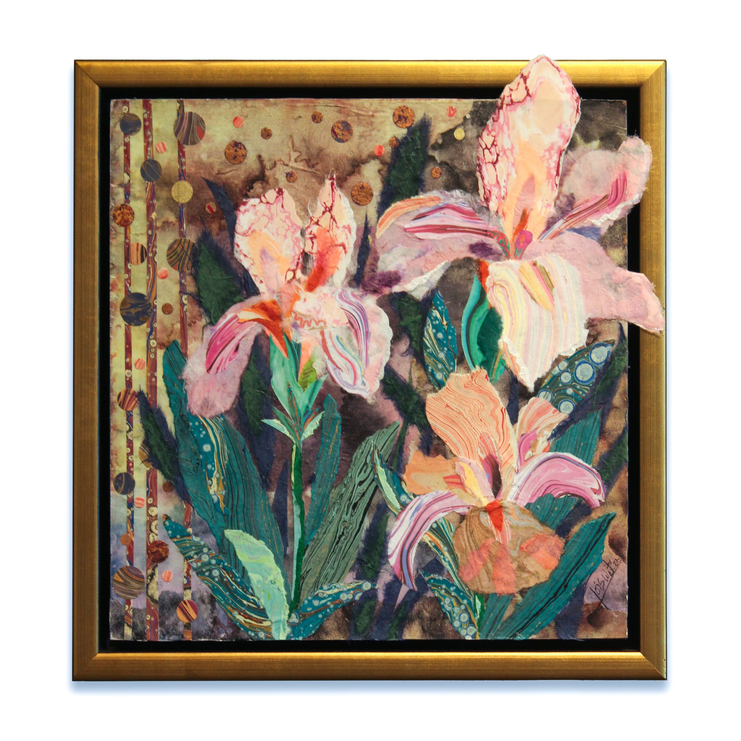 This piece is framed in a gold and black floater frame with paper details.