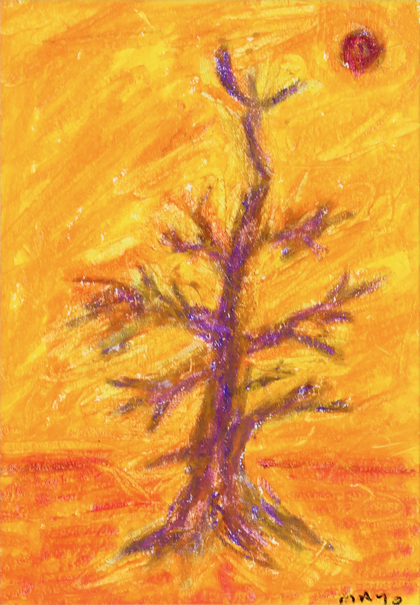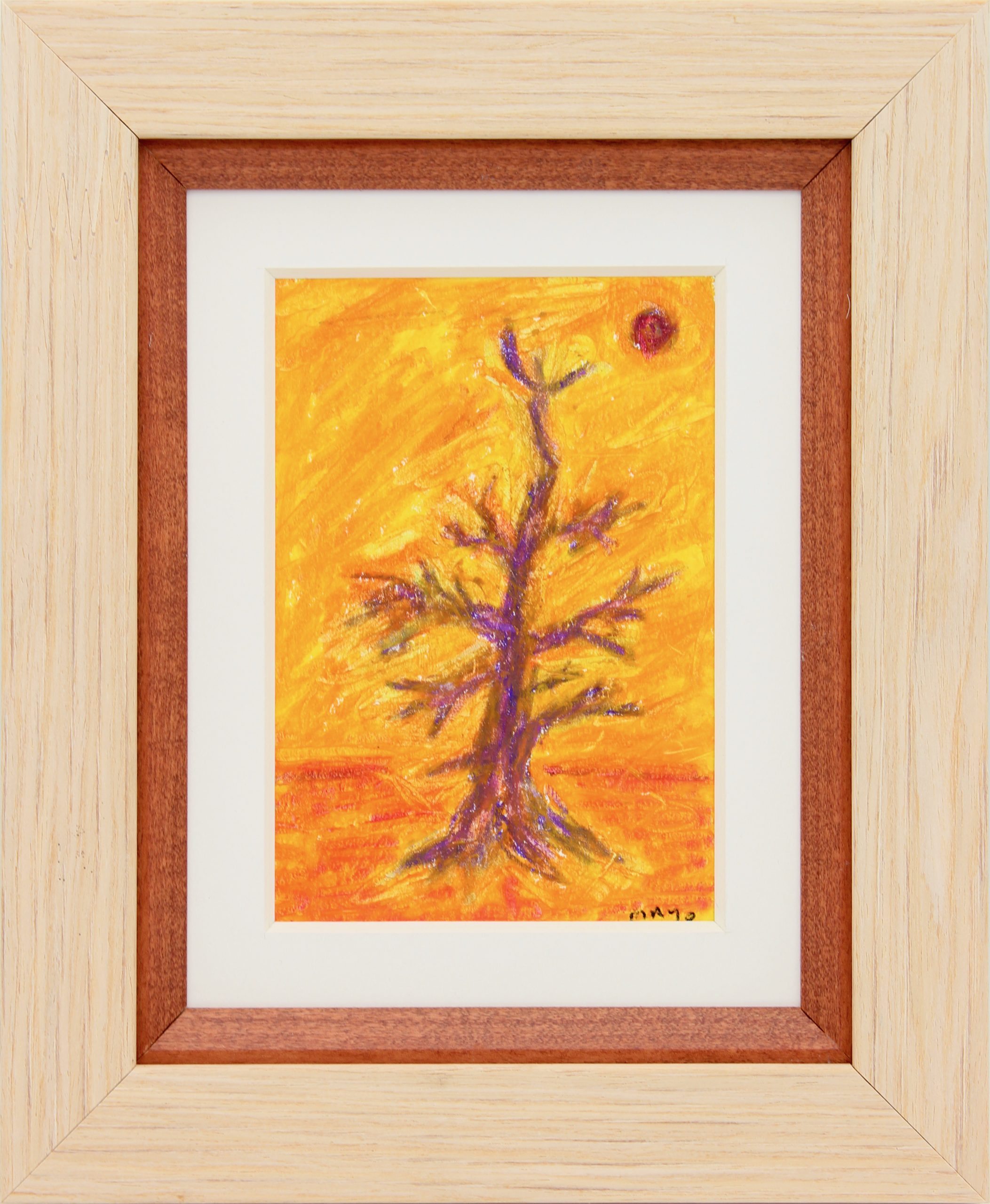 This painting is framed in a natural wood frame with cherry wood inset and white mat behind glass.