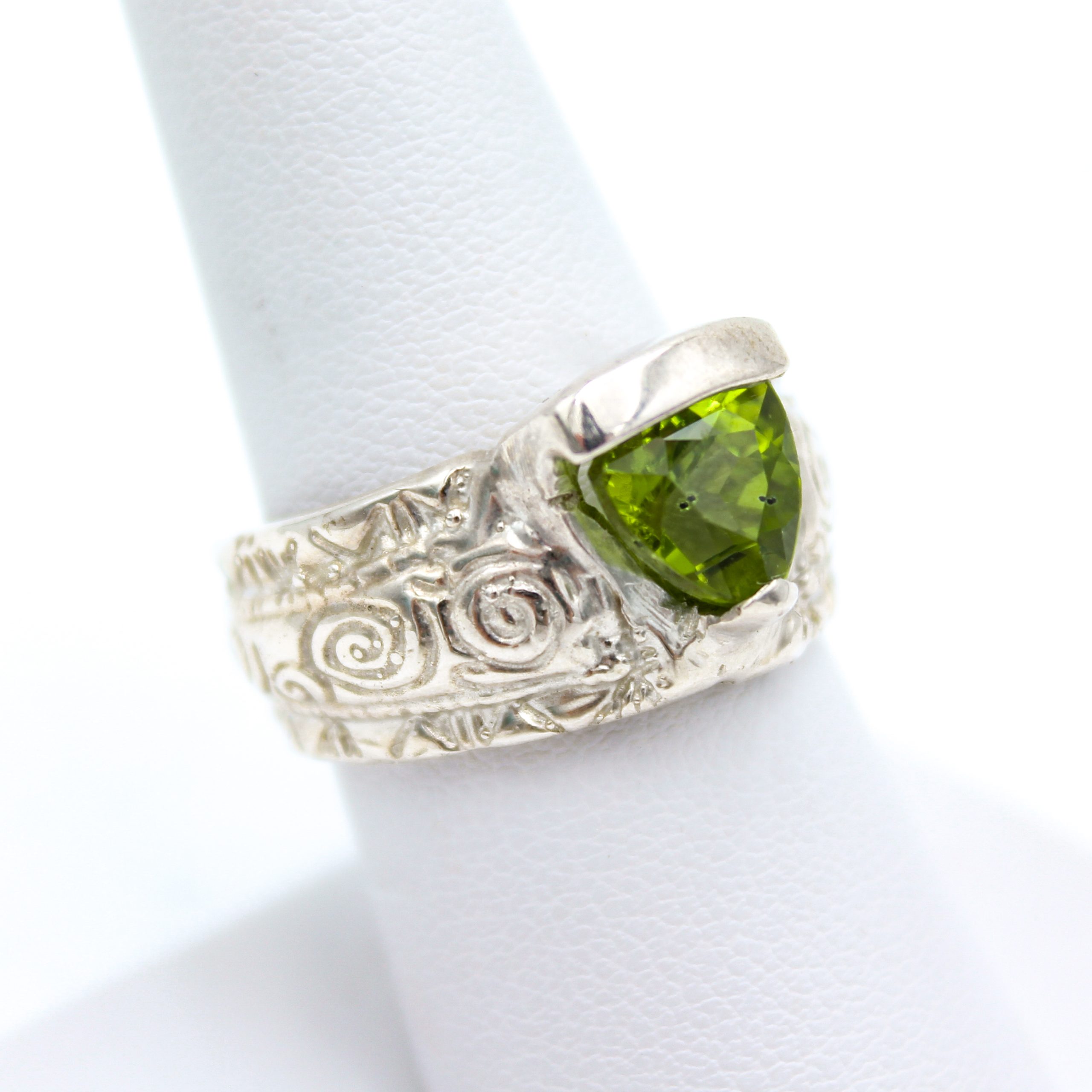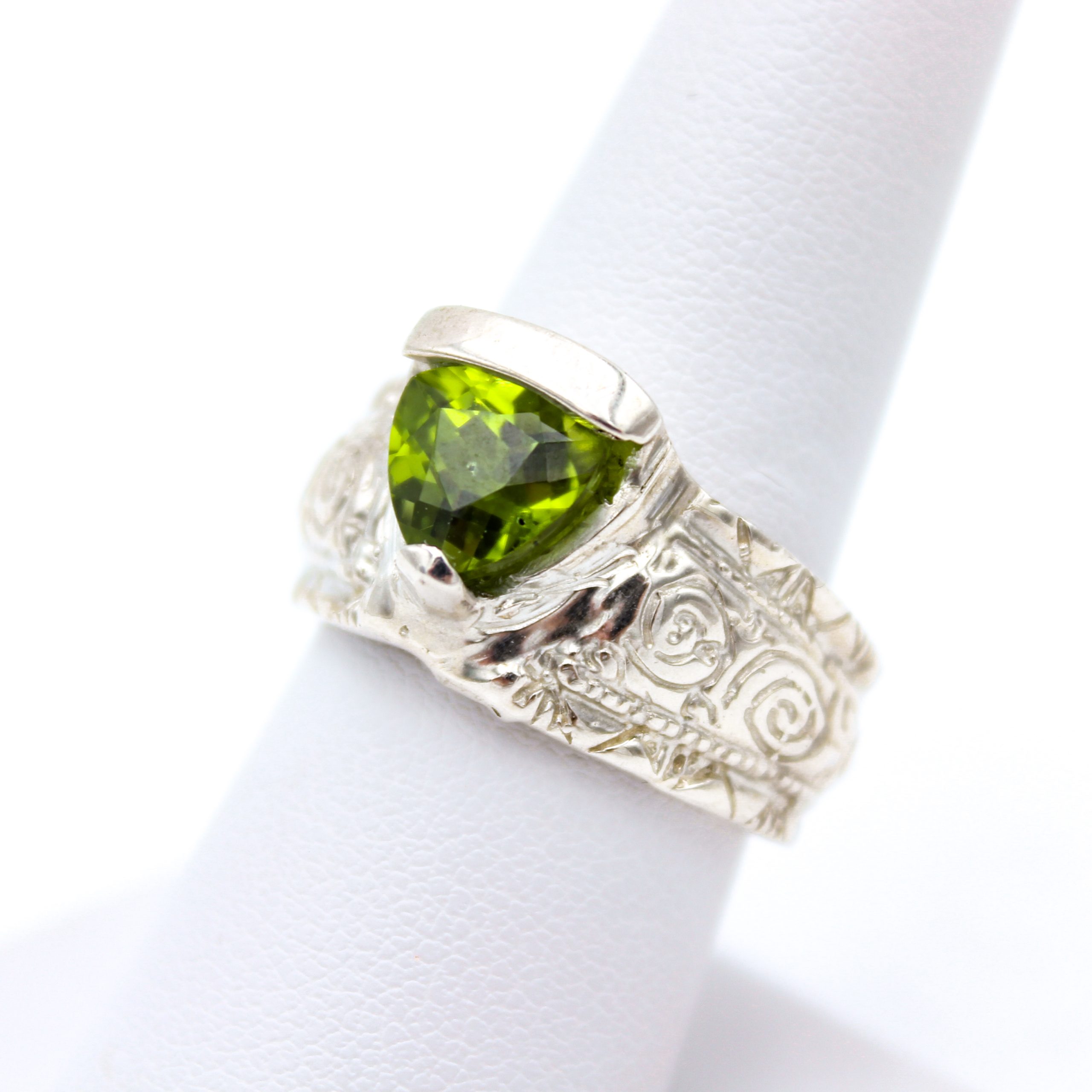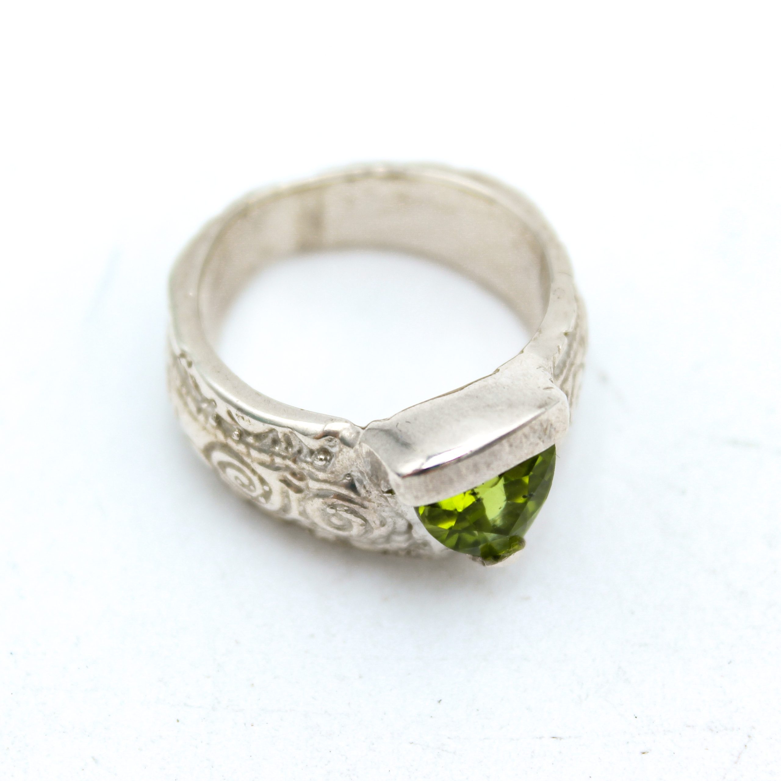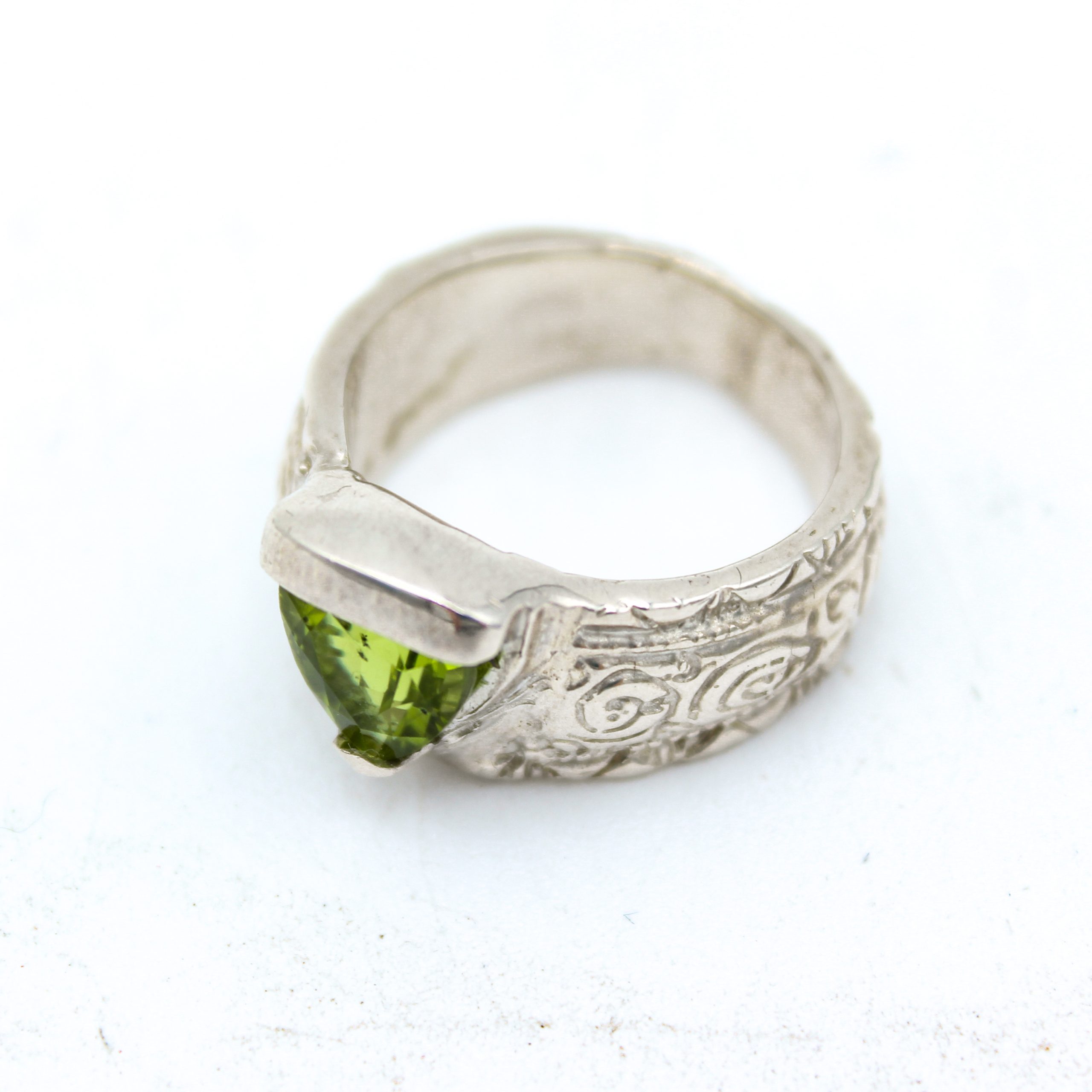 Sterling Silver Ring – “Tribal” Design with Trillion Peridot