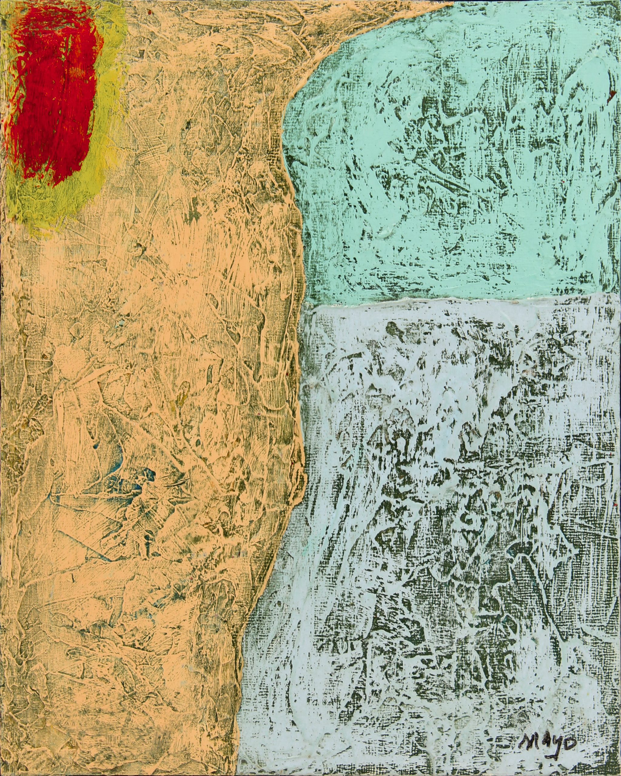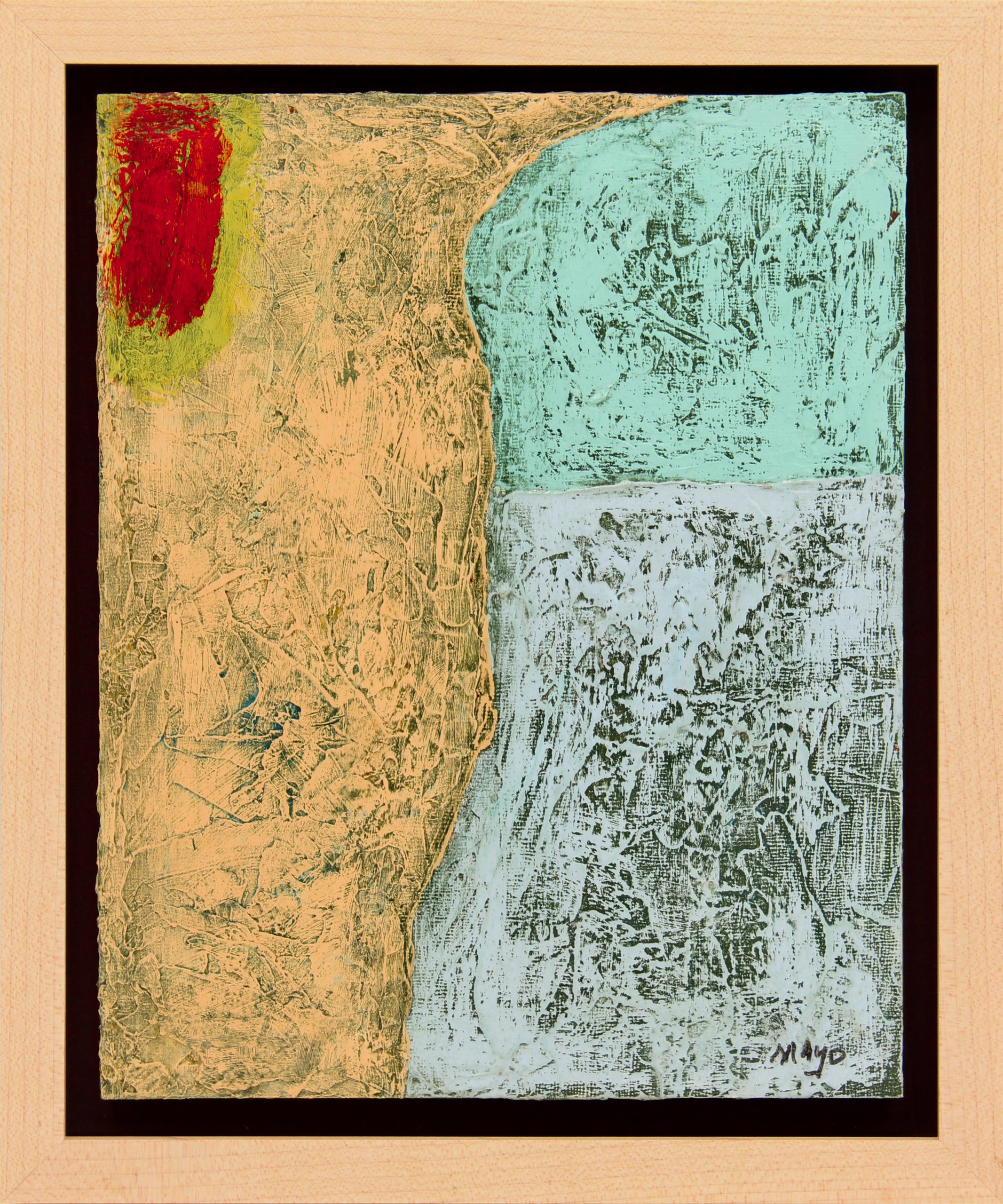This painting is framed in a natural wood floater frame with dark brown backing.