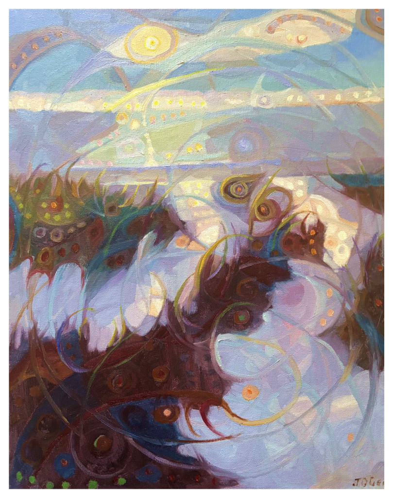 This June, gallery artist Joanne Geisel exploring brand new dimensions to her designs! Painter Joanne Geisel uses oil to capture our Carolina coastlines, working from her photos or life to authentically render each scene. After an initial foray into abstraction in 2022, Joanne outwardly returned to impressionism, while cultivating the lessons she’d learned behind-the-scenes. Now, in addition to her impressionist landscapes, we can finally offer expressive landscapes from Joanne Geisel’s own imagination, using abstract colors and curves to visualize their winds, currents, and movements.